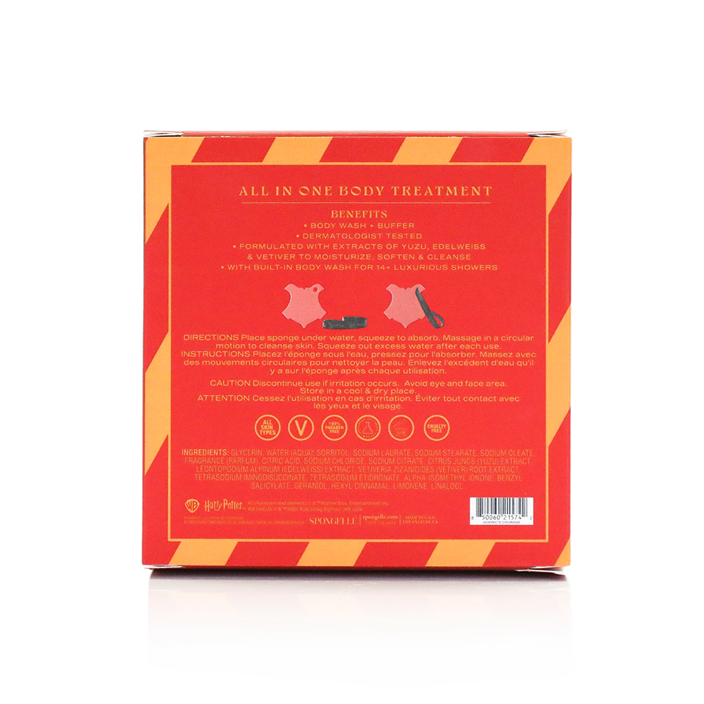 Discover the magic of Harry Potter™ with the spellbinding Harry Potter™ X Spongellé® Collection. Fans of Gryffindor™ will delight in Godric’s Courage, an enchanting blend of captivating red rose, bold aquatic notes, and mesmerizing musk to inspire bravery and determination. Activate the creamy cleansing fragrance power of each Body Wash Infused Buffer® by placing it under running water to release our signature cloud-like aromantic suds for an enhanced bathing experience packed with gentle exfoliating massage. Fragrance Notes Top: Red Rose, Lily of the Valley Middle: Greens, Aquatic Nuances Base: Amber, Musk