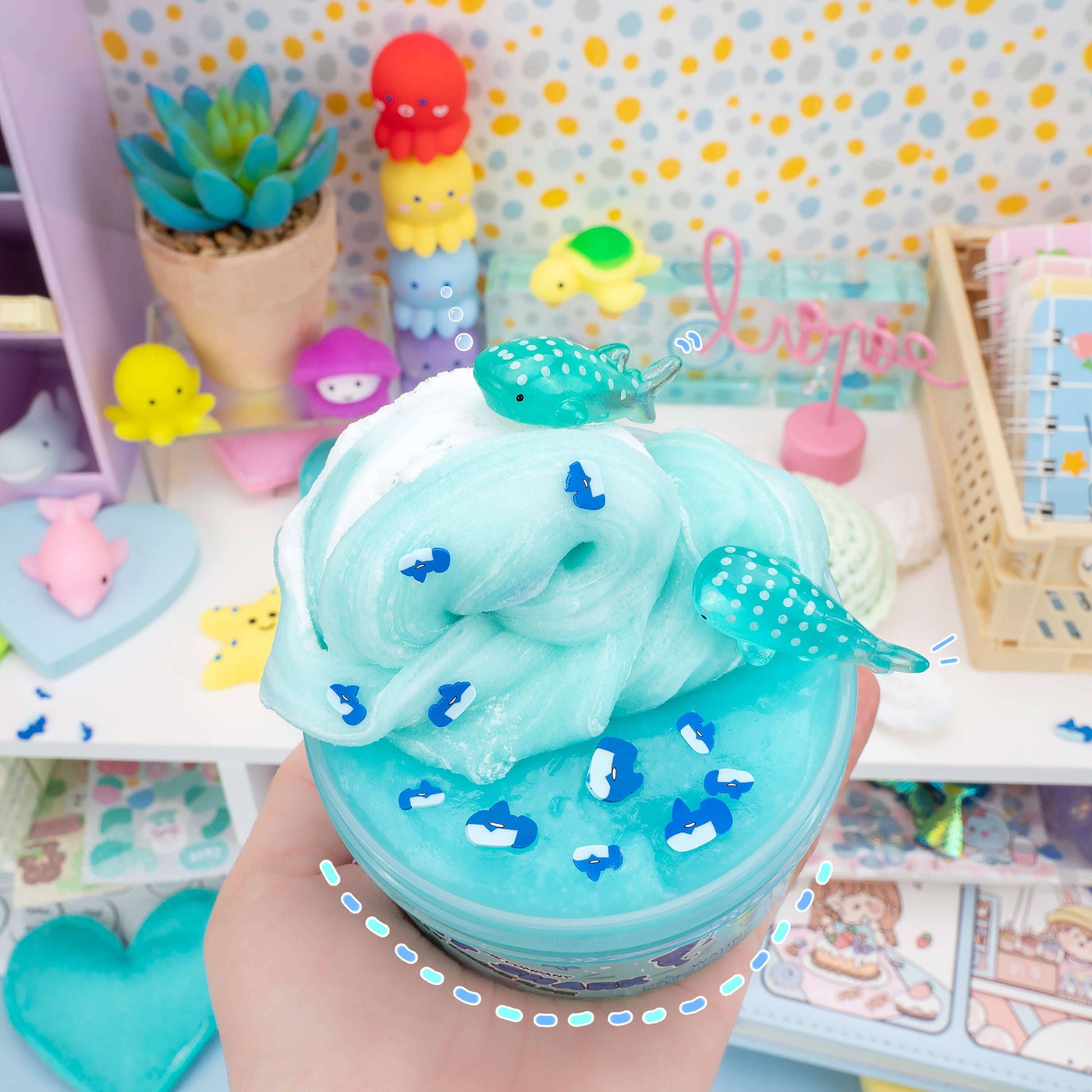 Beware, there are sharks everywhere! This fun and vibrant Slime is full of shark fimo slices swimming inside the most beautiful Slimey ocean you have ever seen. Our Jelly Creme texture feels cool to the touch and is swirled with pieces of white Meringue Slime and comes with 2 adorable whale shark charms. The combination creates the most hypnotic swirls that are reminiscent of sea foam and when combined together makes for a creamy, icy consistency that makes wonderful bubble sounds when inflated. We scented Gummy Shark with a blend of blue raspberry candy and marshmallow cream, it smells so amazing!