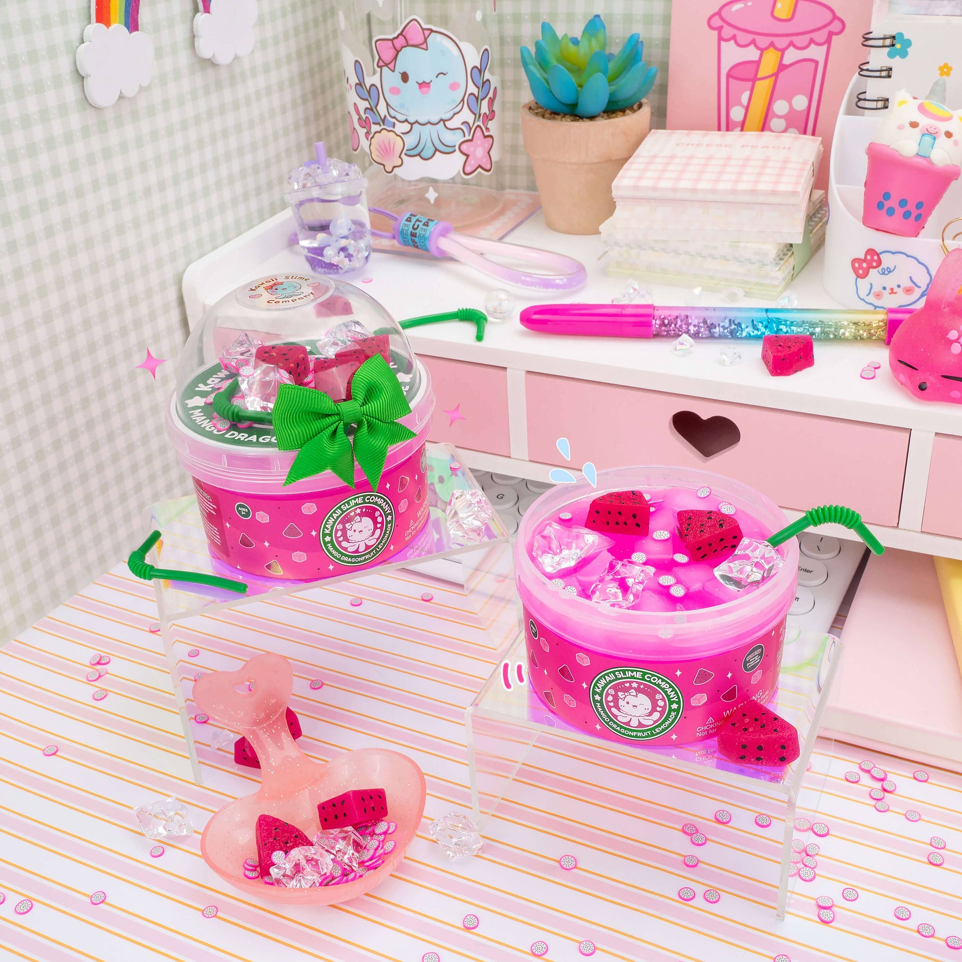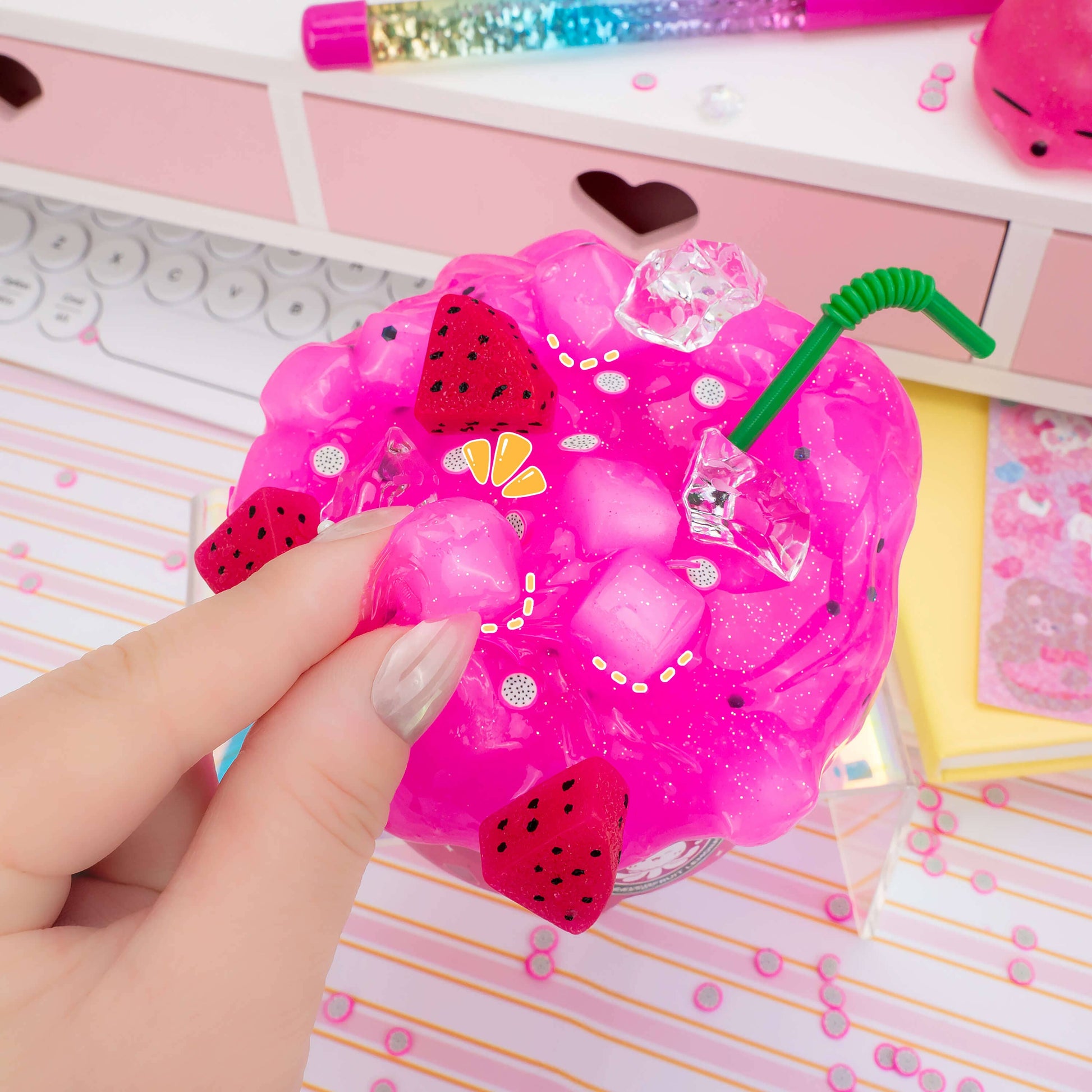 Treat yourself to the refreshingly fruity slime experience with our Mango Dragonfruit Lemonade Refresher Jelly Cube Slime – your favorite new beverage is now in slime form! Enjoy the vibrant, citrusy fragrance while squishing and popping the jelly cube textured slime and imagining the taste of real refresher! Who knew slime could be this invigorating!?