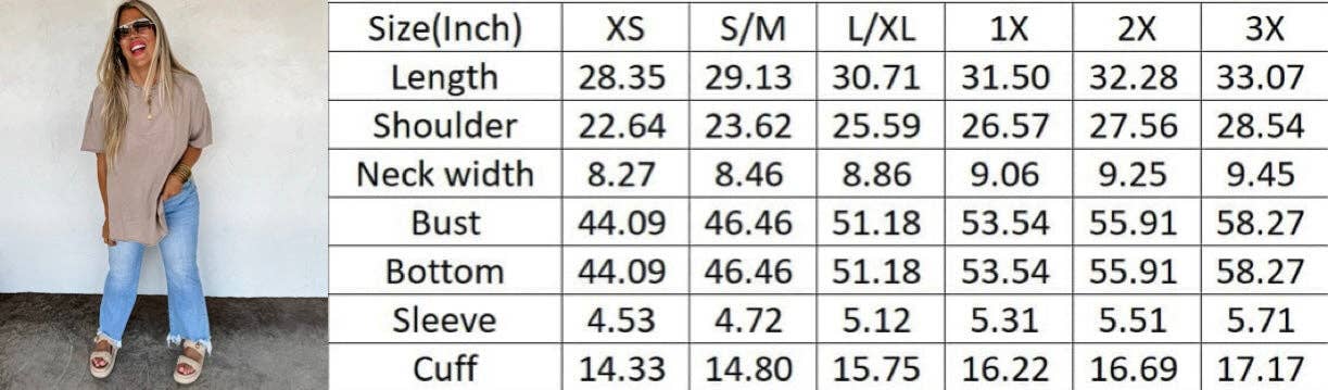 The perfect washed cotton, super soft boyfriend tee that everyone needs! Faded “vintage” colors. Features flattering rounded front and back hem with side slits! Pair with cardigans or wear with jeans or leggings! Fit: Oversized and slouchy - size down if you don't want it to fit so oversized. MODEL: BLAKELEY- 5’6 size 14 wearing L/XL BIANKA- 5'6 size 4/6 wearing S/M CAMERON- 5'1 SIZE 2 wearing MADE OVERSEAS FABRIC: 100% PREWASHED COTTON CHEETAH FABRIC: 85% POLY 25% RAYON XS- 0-4 S/M: 6-8 L/XL: 8-14 1X: 16/18 2x: 18/20 3x: 20/22