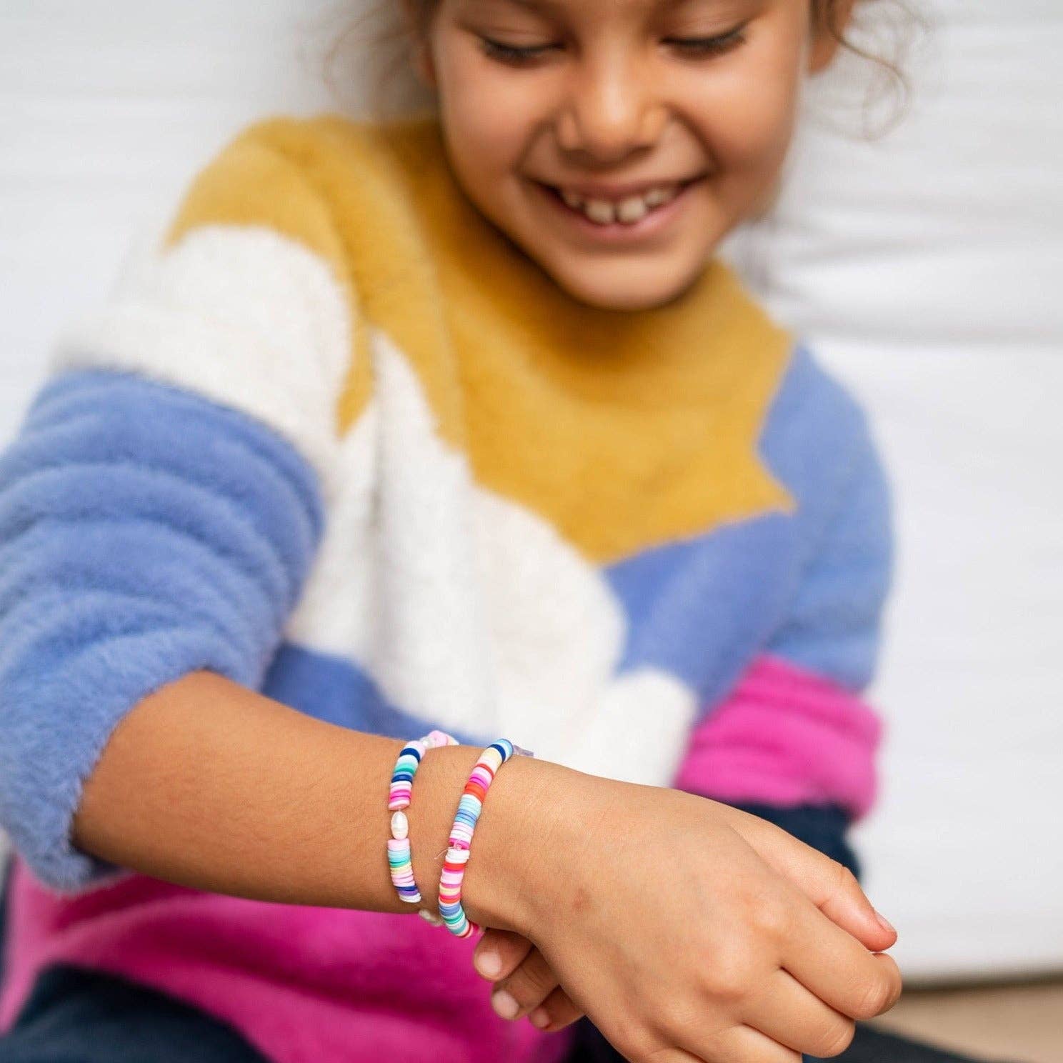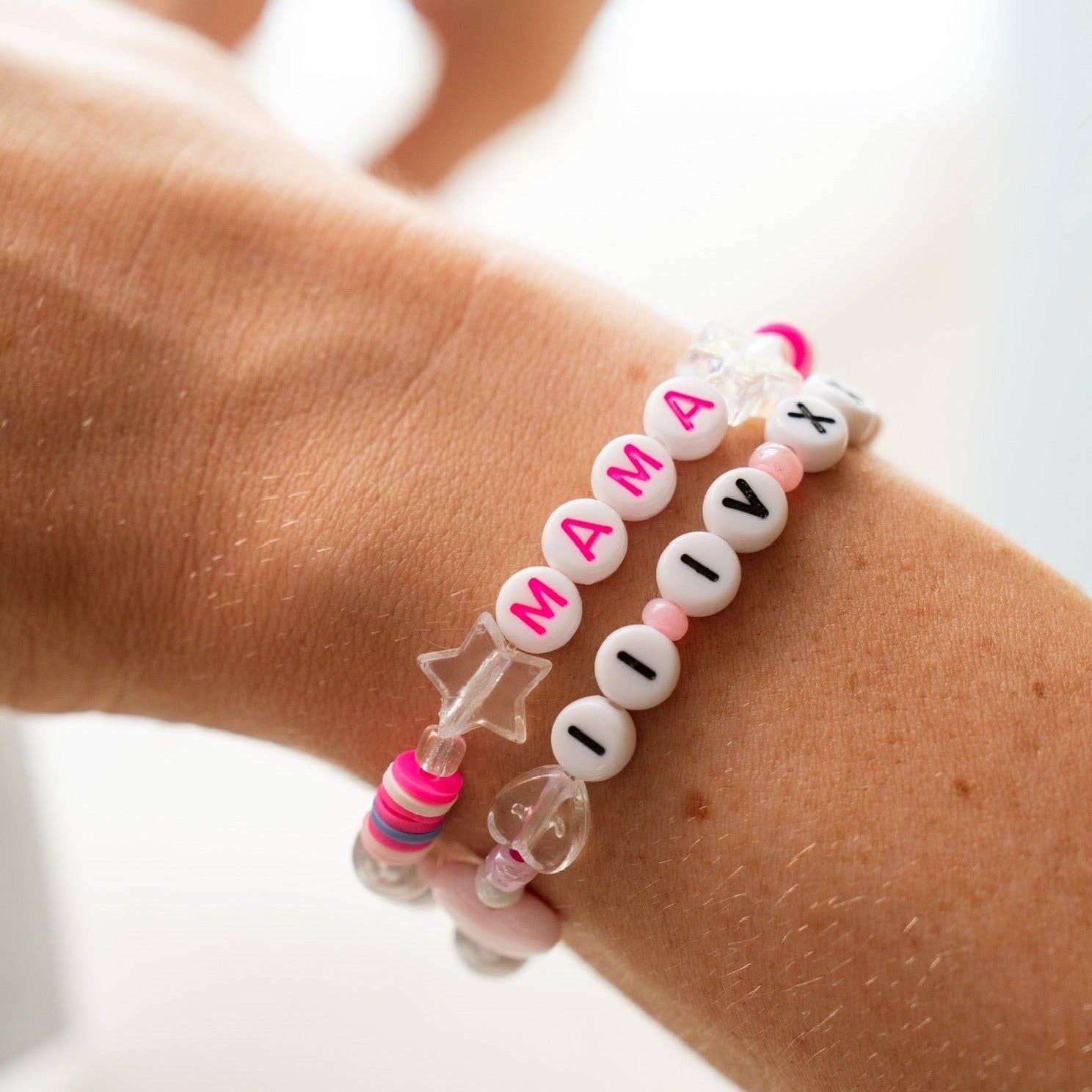 Our Over the Rainbow Bead Kit comes with a variety of beads to create your own bracelets or necklace. This kit features hot pink and white alphabet beads, clay beads, iridescent heart and star beads, white disco pearl beads, flower beads, happy face beads, and pink and clear string.
