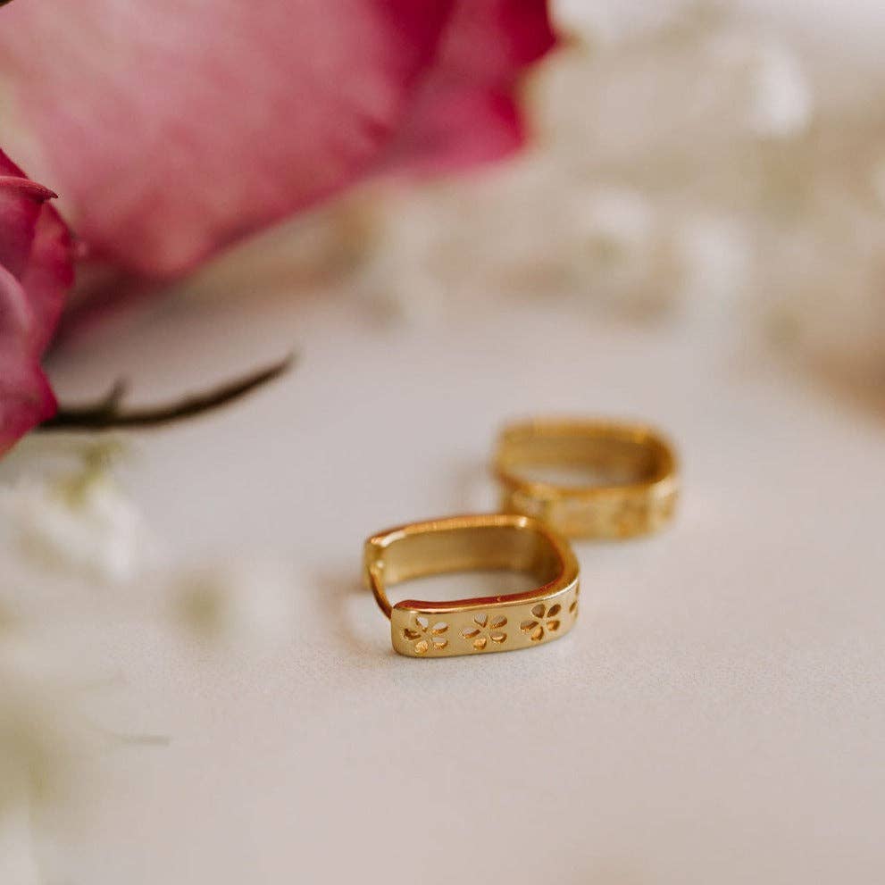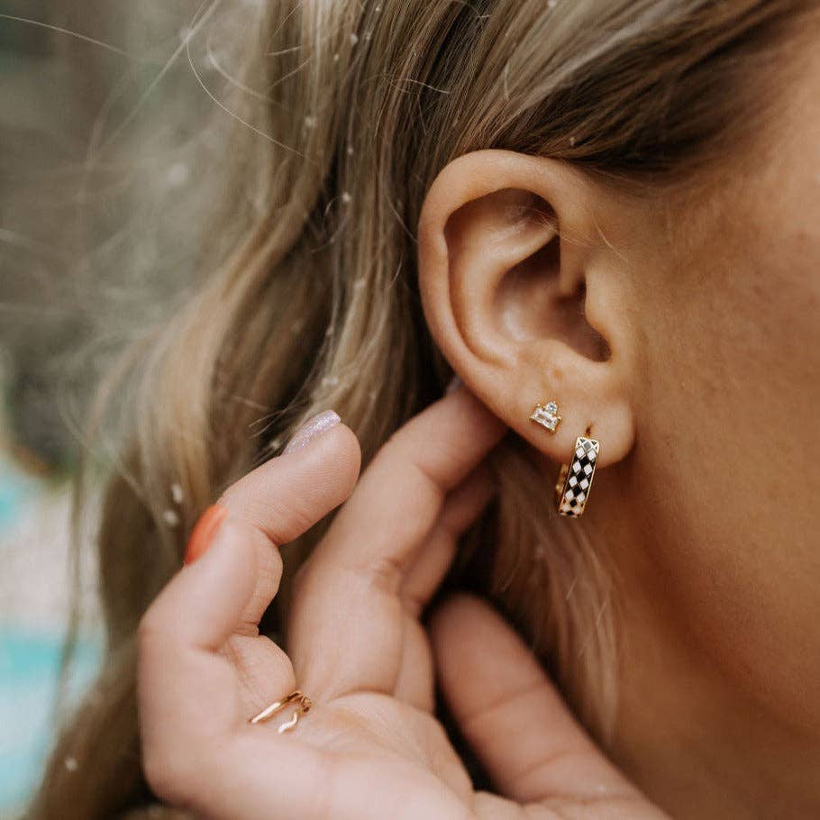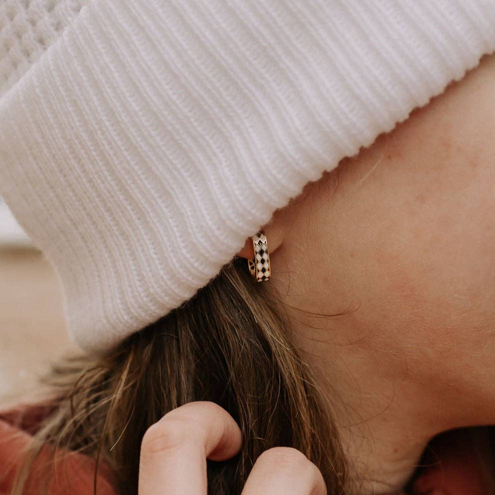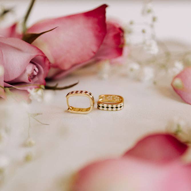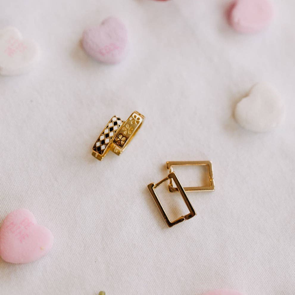 The Times Square Reversible Hoops are made of high quality gold vermeil metal and are hypoallergenic and good for sensitive ears. On the front side they feature a unique black and white diamond checker pattern, and on the other side feature a dainty gold cutout daisy pattern. They can be worn in either direction, meaning you get two earring styles for the price of one!